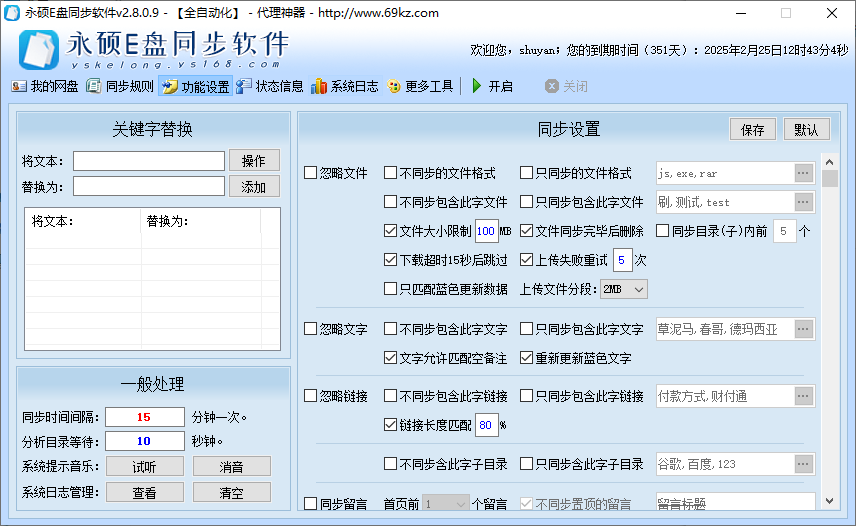 答:你的空间等级与你要同步数据的空间等级。别人网盘是8000M的,已经使用了5000M数据,而你是4000M等级空间,那么就无法完整的将5000M数据同步过来,因为永硕E盘空间等级的限制你根本装不下。 永硕E盘目录数量限制、流量限制等。具体可参考该网页:http://www.ys168.com/list_cp.aspx